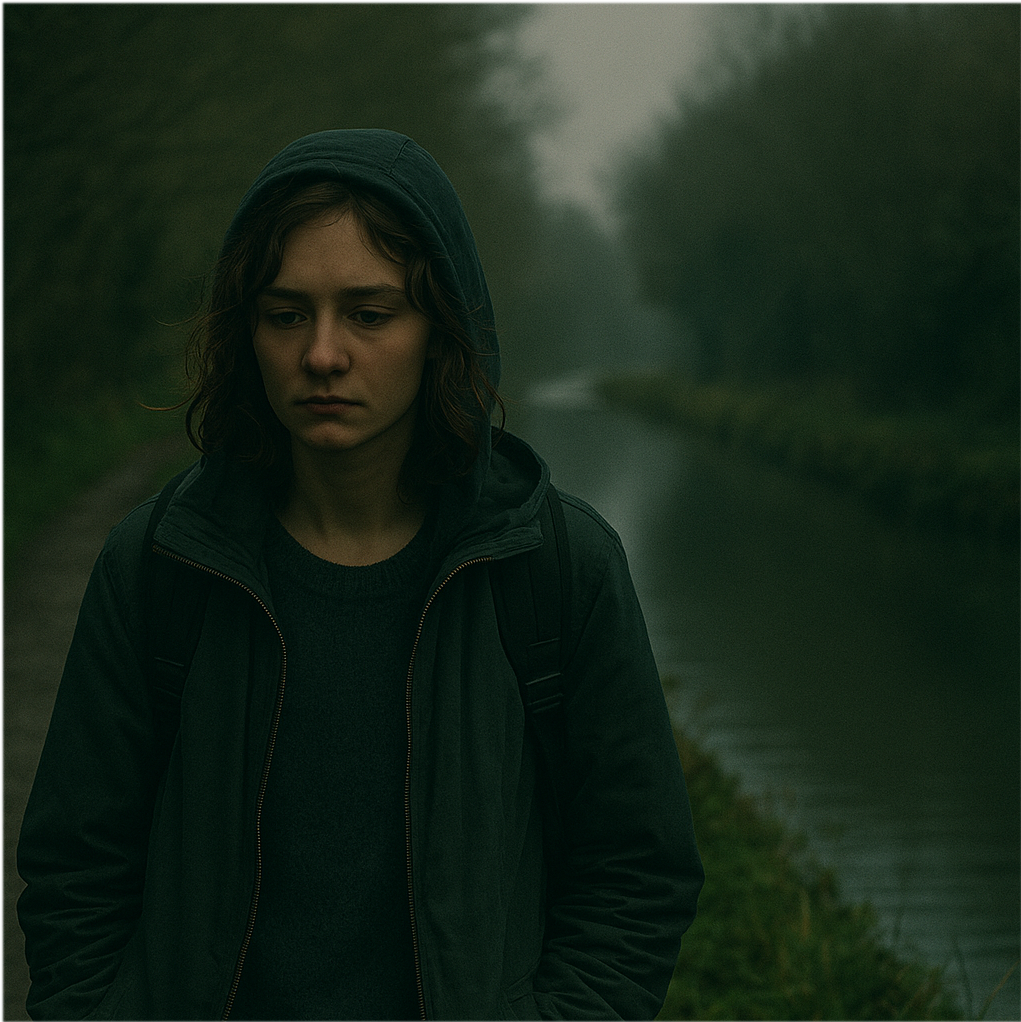 Winding through the forgotten edges of the Midlands, an overgrown canal towpath becomes both passage and purgatory for a young woman with no fixed destination. Wearing a tattered jacket and carrying little more than a small rucksack, she walks alone, tracing a route once used by coal barges and factory workers, now claimed by weeds, rust, and silence.